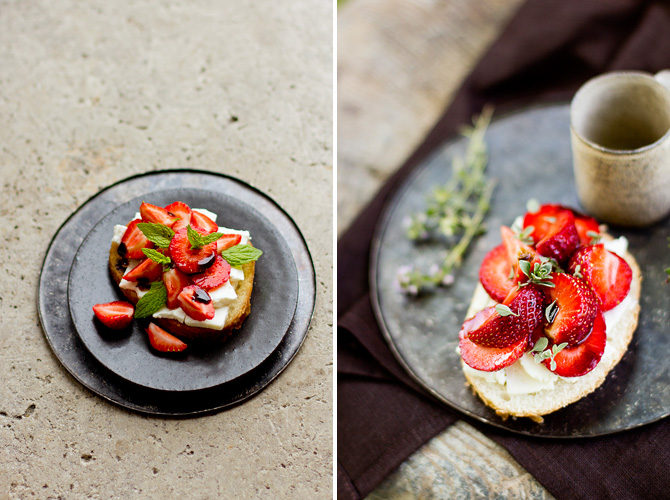 Slice or quarter the strawberries, depending on size, and pile on the feta. Add a handful of mint and basil leaves. Drizzle some balsamic on top.